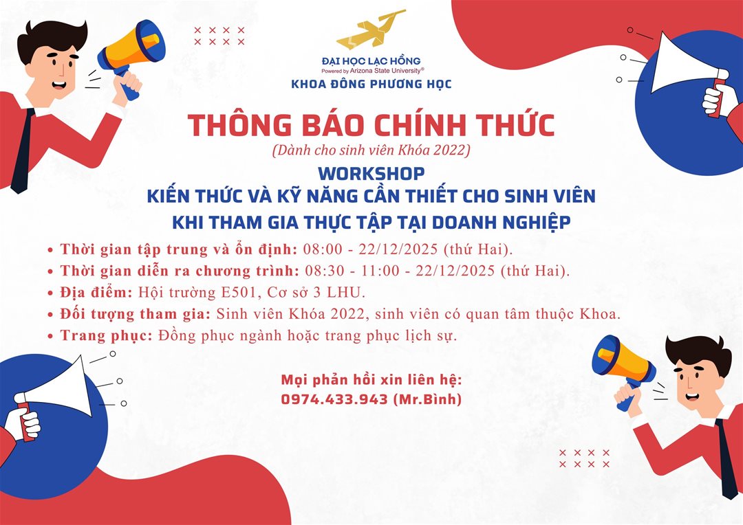 Nhằm chuẩn bị thật kĩ lưỡng cho sinh viên năm cuối (khóa 2022), Khoa Đông phương học trân trọng thông báo thông tin về Workshop "Kiến thức và kỹ năng cần thiết cho sinh viên khi tham gia thực tập tại doanh nghiệp".