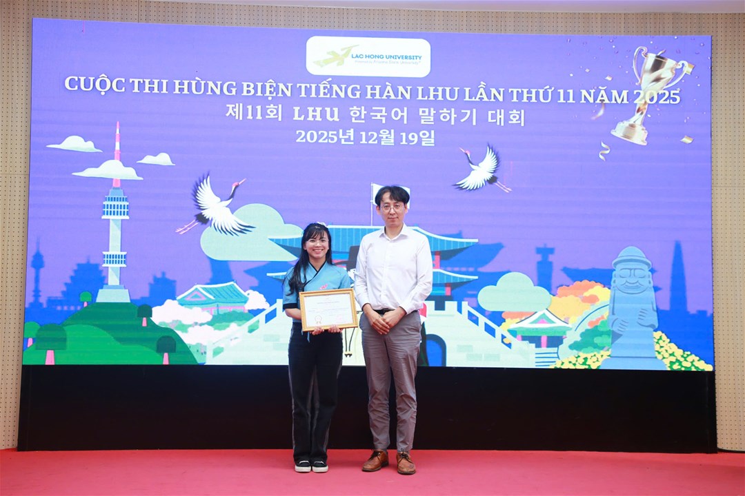 Chiều ngày 19/12/2025, tại Hội trường A301, cơ sở 1, Trường Đại học Lạc Hồng, ngành Hàn Quốc học đã tổ chức thành công Vòng Chung kết Cuộc thi Hùng biện tiếng Hàn LHU lần thứ 11 năm 2025. Đây là một sân chơi học thuật giúp sinh viên ngành Hàn Quốc học có cơ hội nâng cao khả năng sử dụng tiếng Hàn, đặc biệt là kỹ năng nói và thuyết trình. Cuộc thi không chỉ khuyến khích sự tự tin trong việc biểu đạt tiếng Hàn mà còn mở ra cơ hội cho các bạn sinh viên thể hiện sự am hiểu về văn hóa, đất nước, con người Hàn Quốc, góp phần thắt chặt mối quan hệ tốt đẹp giữa nhân dân hai nước Việt Nam - Hàn Quốc.