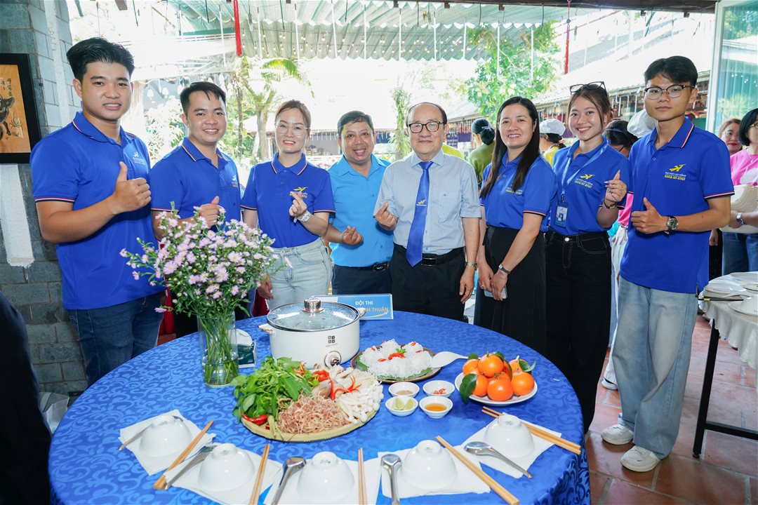 Ảnh 1: Tập thể đội thi “Lẩu gà Bình Thuận – Khoa Quản trị” cùng các thành viên tham gia chương trình.
